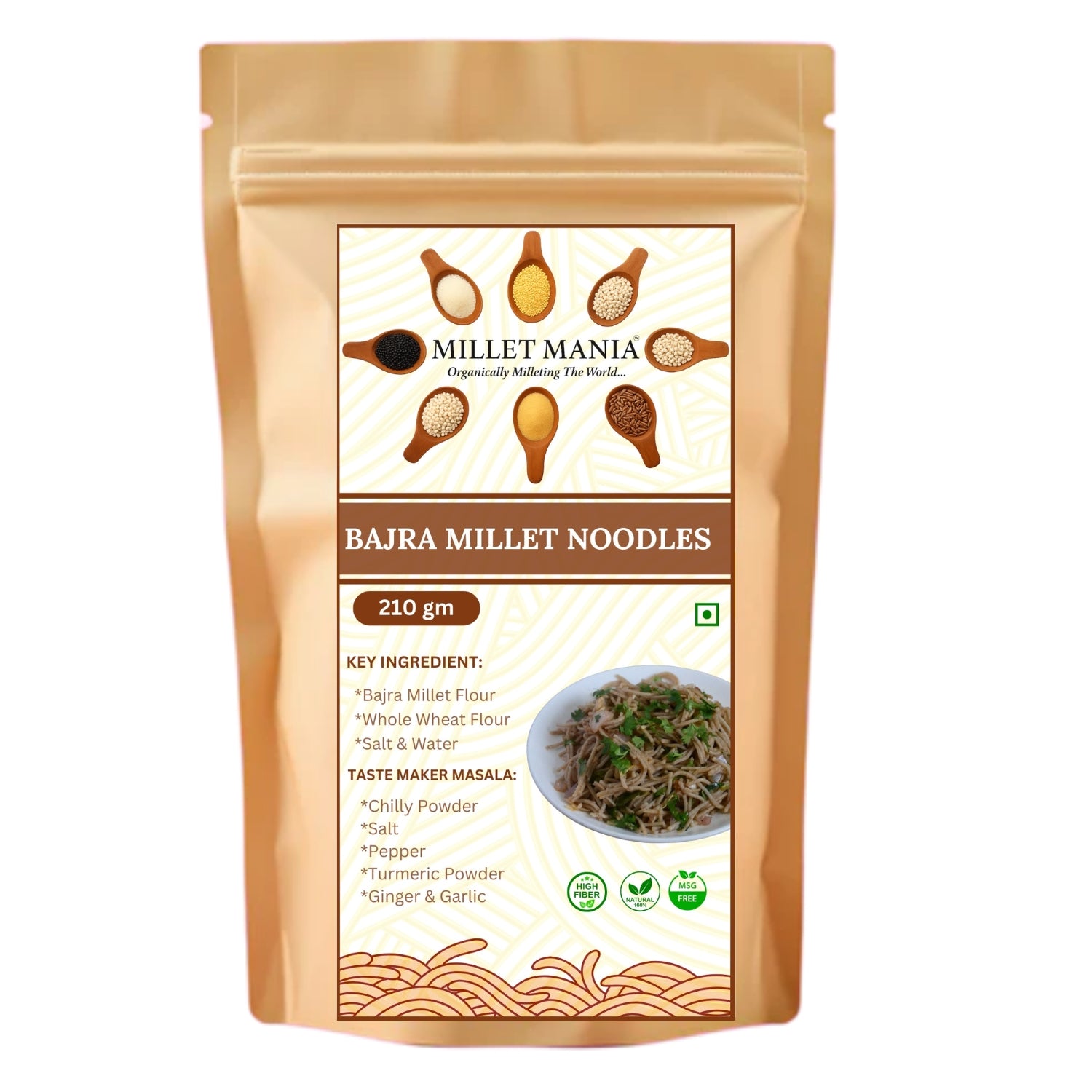Enjoy the wholesome goodness of Bajra (Pearl) Noodles (210g)—a nutritious and delicious meal option made from Bajra Millet Flour and Whole Wheat Flour. These noodles are rich in fiber, low in fat, and free from harmful chemicals or preservatives, making them a perfect choice for a healthy and balanced diet.