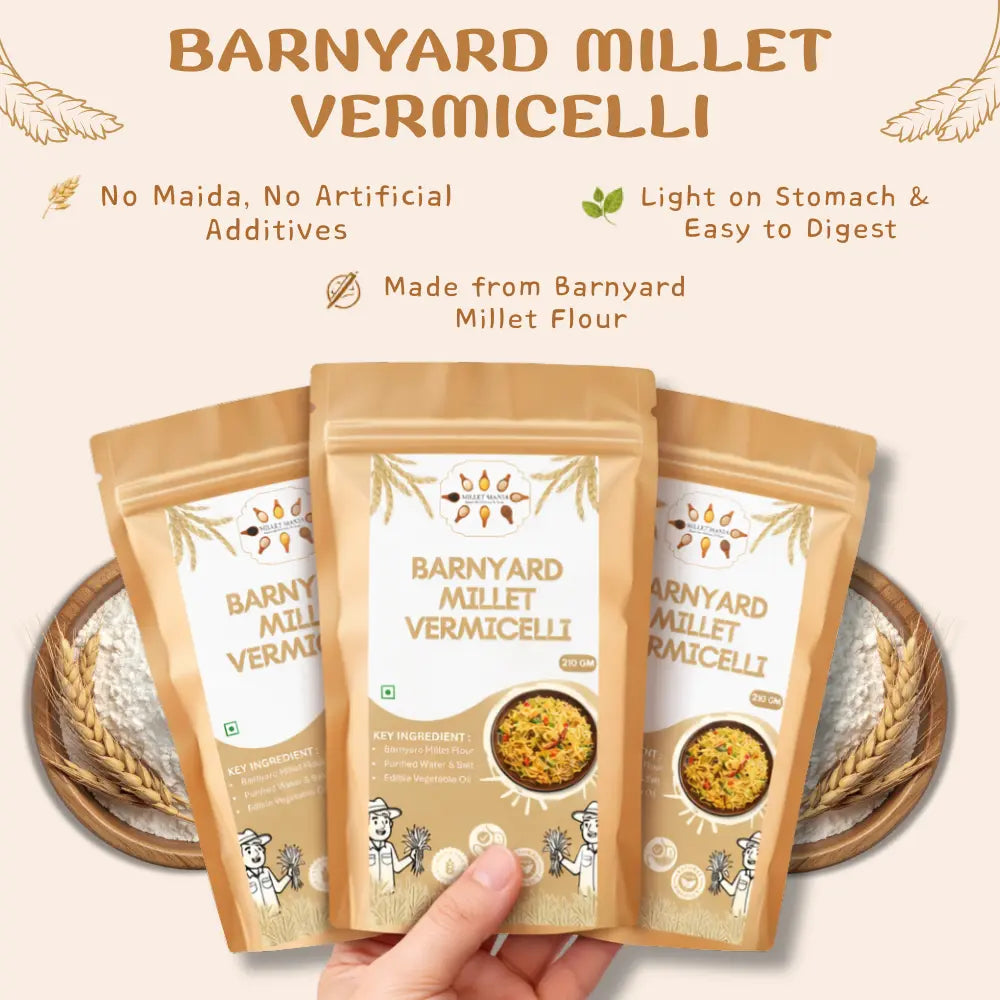 Discover the natural goodness of Barnyard Millet Vermicelli (210g)—a nutritious and organic option for a balanced diet. Made with Barnyard Millet Flour, Whole Wheat Flour, Salt & Water, this vermicelli is rich in fiber, low in fat, and free from harmful chemicals or preservatives.