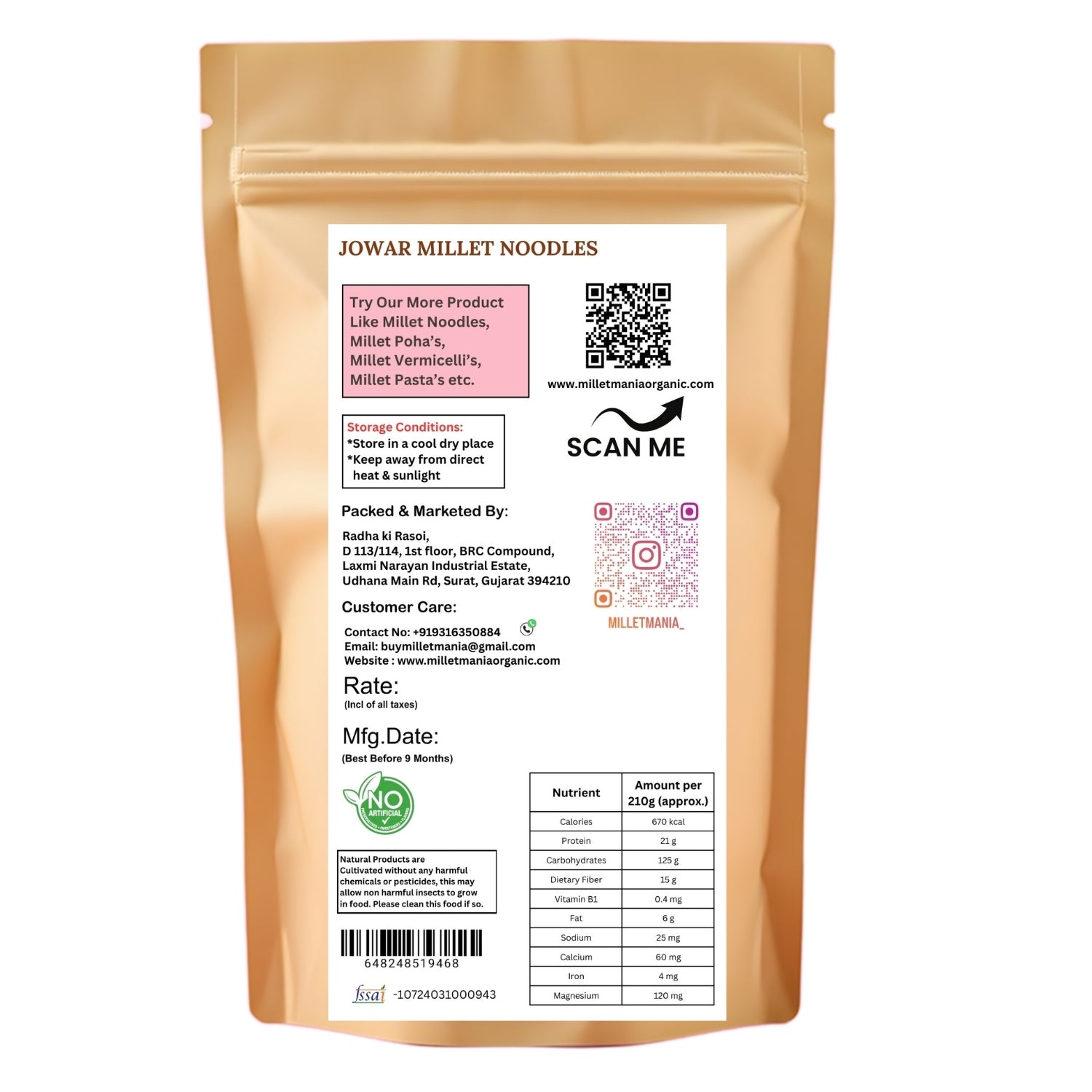 Jowar is a whole grain known for its rich antioxidants, high iron content, and low glycemic index, making these noodles an ideal choice for diabetics, fitness enthusiasts, and health-conscious families. Free from maida, preservatives, and artificial additives, our millet noodles offer a wholesome, natural, and flavorful option for quick meals, lunchboxes, and light dinners.