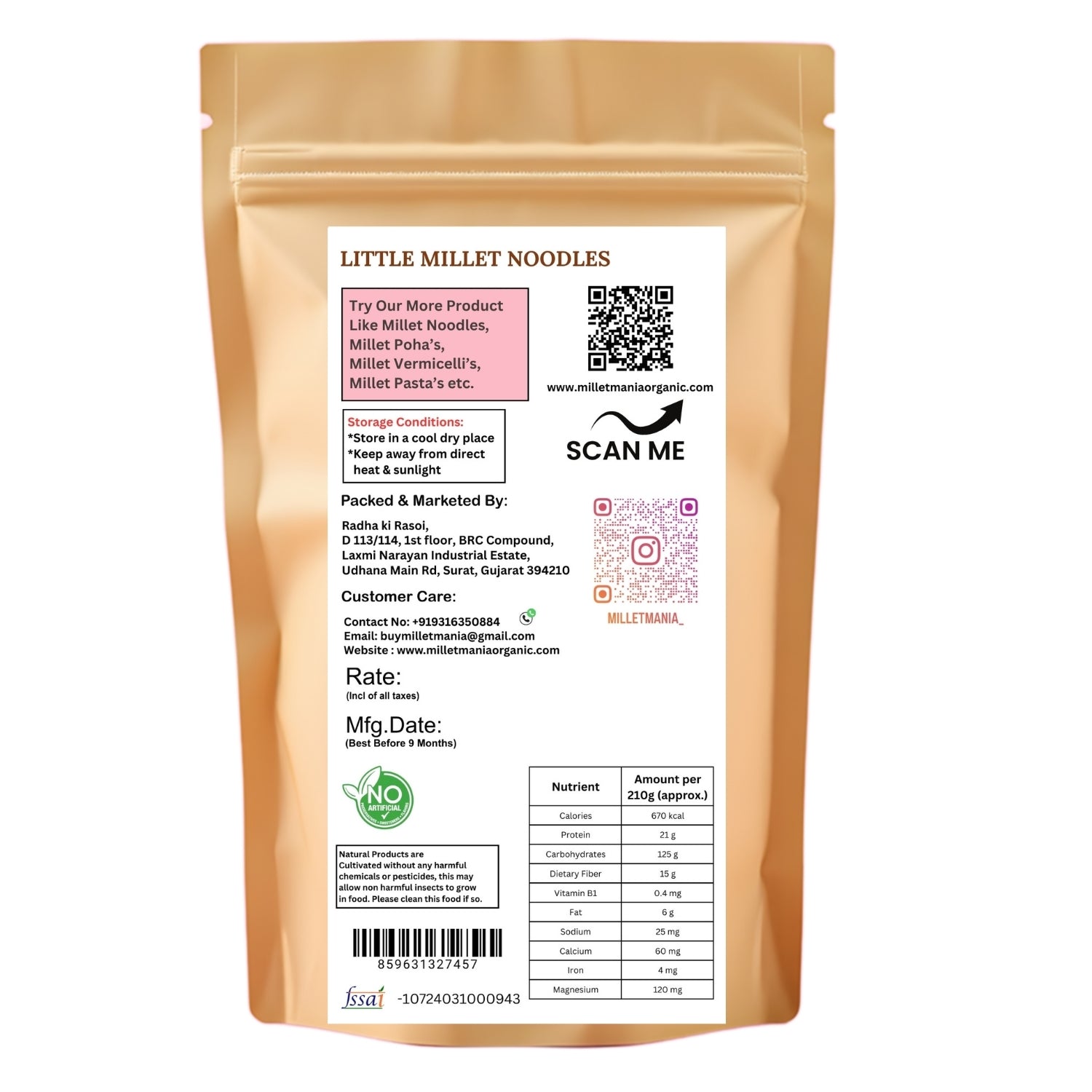 Enjoy a delicious and health-conscious alternative to conventional noodles with Little Millet Noodles. Made from the ancient grain little millet, these noodles are naturally high in dietary fiber, plant-based protein, and essential minerals. Their light texture and mildly nutty flavor make for a satisfying yet easily digestible meal.
