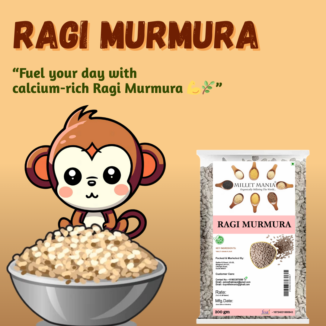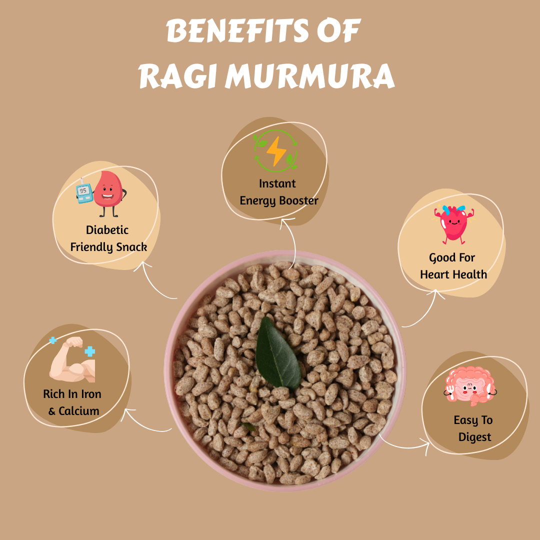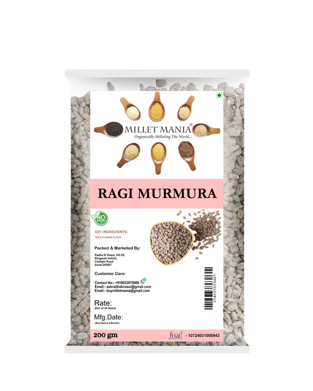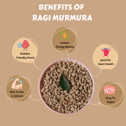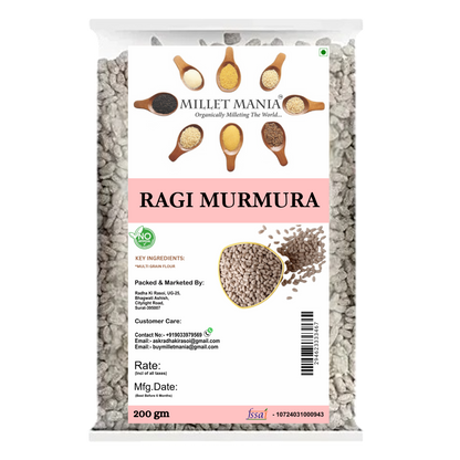Ragi (finger millet) is known for its rich calcium, iron, and antioxidant content, supporting bone health, digestion, and sustained energy levels. This murmura is free from preservatives, artificial additives, and chemicals, ensuring a pure and natural choice for health-conscious eaters.